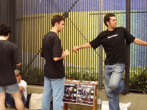 Acordamos a Eva antes das 5 da manhã. Obviamente que a coitada não sabia no que estava se metendo quando concordou em hospedar dois nerds malditos. Chegamos, tomamos café e já saímos para o Colégio Marista, onde se daria a Fest Comix. Descobrimos que uma camiseta com o nome da nossa revista abre portas. Literalmente. Assistimos à preparação inicial dos caras da Comix e acertamos alguns outros detalhes, depois fomos para a entrada começar a vender. Quinta, para a nossa sorte (nunca pensei que fosse dizer isso um dia) foi o dia que teve a maior fila. Às 9 da manhã já haviam nerds desgraçados esperando para entrar. Vendemos alguns e, enquanto eu descobria que o pessoal não saía pelo mesmo lugar por onde entravam, o André voltou pra casa para pegar uma mesinha providencial. Ficamos na saída o resto do dia, ora debaixo de chuva, ora debaixo de Sol. Encontramos o Cadu Simões, do Garagem Hermética, e fizemos uma parceria com o cara. Gente fina, também.