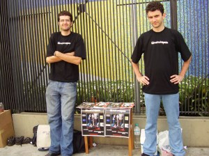 Encontramos o Pablo Casado, um dos colaboradores da revista, lá do Alagoas, e o Zé Oliboni, do Pop Balões, mas infelizmente os dois tiveram de ir embora. Também batemos um papo rápido com o Ivan Reis, que é outro cara gente finíssima (Não, não tem cara só gente boa nesse ramo, tem muito filho da puta, mas demos sorte dessa vez). Logo em seguida, retornamos para a saída para retomar as vendas. Qual não foi nossa surpresa quando vimos gente procurando por nós!!! Animados, vendemos mais um tanto e o Cadu quase esgotou o Garagem Hermética.
