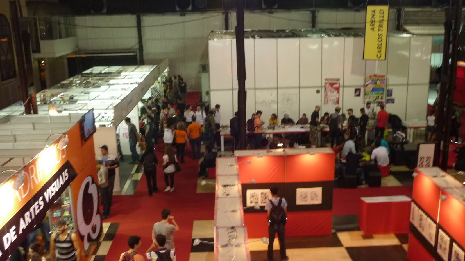 Meu, estou quebrado. Meu corpo está todo doído de carregar peso no dia anterior e o primeiro dia foi só correria para lá e para cá. O movimento foi intenso, o que é raro para o primeiro dia de evento. Logo de manhã já tinha gente querendo fazer cadastro no site, caricaturas com o André e comprar as revistas.