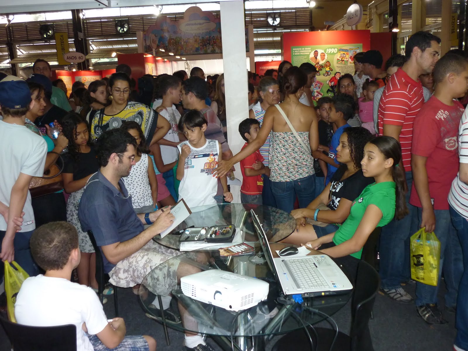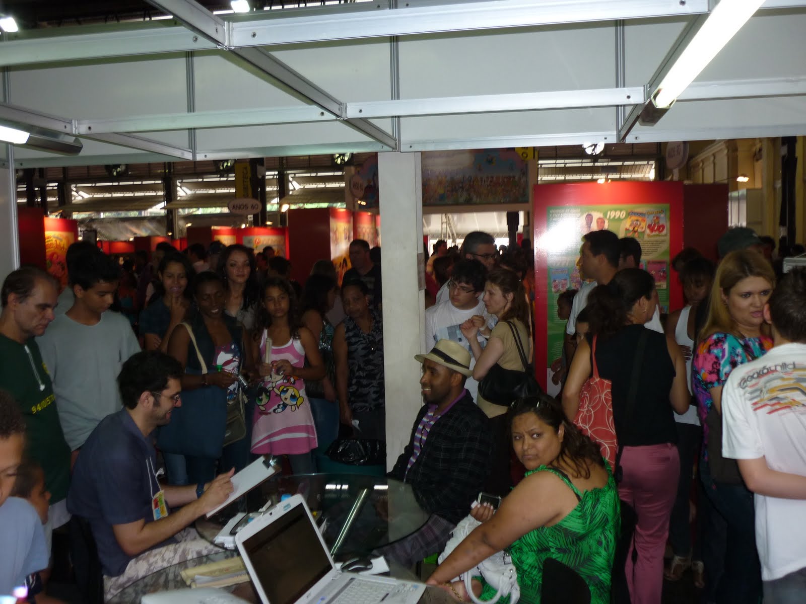 Mano, vou te falar… hoje estou que é só o pó. Sábado foi o melhor dia e ao mesmo tempo o pior. Melhor, por ter sido o mais movimentado. E pior… por ter sido o mais movimentado. Hehehe. Desde manhã cedo, não paramos um minuto. O André já estava destruído de tanto fazer caricaturas. Era três horas da tarde e ele decidiu parar, não apenas pensando no próprio bem-estar, mas também para poder curtir um pouco o evento, coisa que ele ainda não tinha conseguido fazer. A Thaís nos ajudou no estande, algo que foi absolutamente necessário.