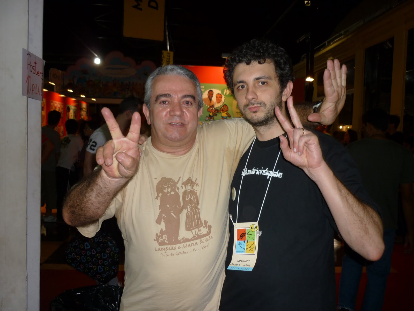 Nas fotos: eu e Giorgio Cali, o movimento do estande, fotos com o Catitu, da folga nas prateleiras e do fim da “noitada”.
