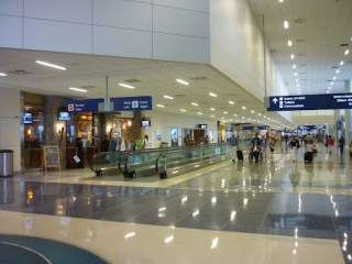 No geral, os vôos foram tranquilos, mas a viagem foi bem exaustiva. Cheguei em São Paulo, peguei ônibus de Congonhas para Guarulhos e tive que ficar mofando lá até as 23 horas. Tenso. Cheguei em Dallas às 12:15 do outro dia. Baita aeroporto gigante, tem dois terminais, sendo que cada um é mais ou menos do tamanho do aeroporto de Guarulhos. Talvez mais. Só que, claro, muito mais organizado, muito mais limpo e bonitinho. Tive que tirar uma foto, porque me lembrou muito o aeroporto da fase final de Max Payne 3. O jogo supostamente se passa em São Paulo, mas pela foto dá pra entender de onde veio a inspiração pro design, concordam?