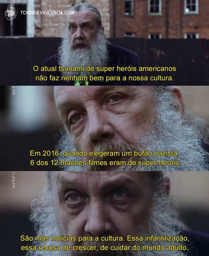 Recentemente vi bastante gente postando a foto abaixo, em que Alan Moore critica o “tsunami” de super-heróis, afirmando que devemos “crescer e cuidar do mundo adulto”.