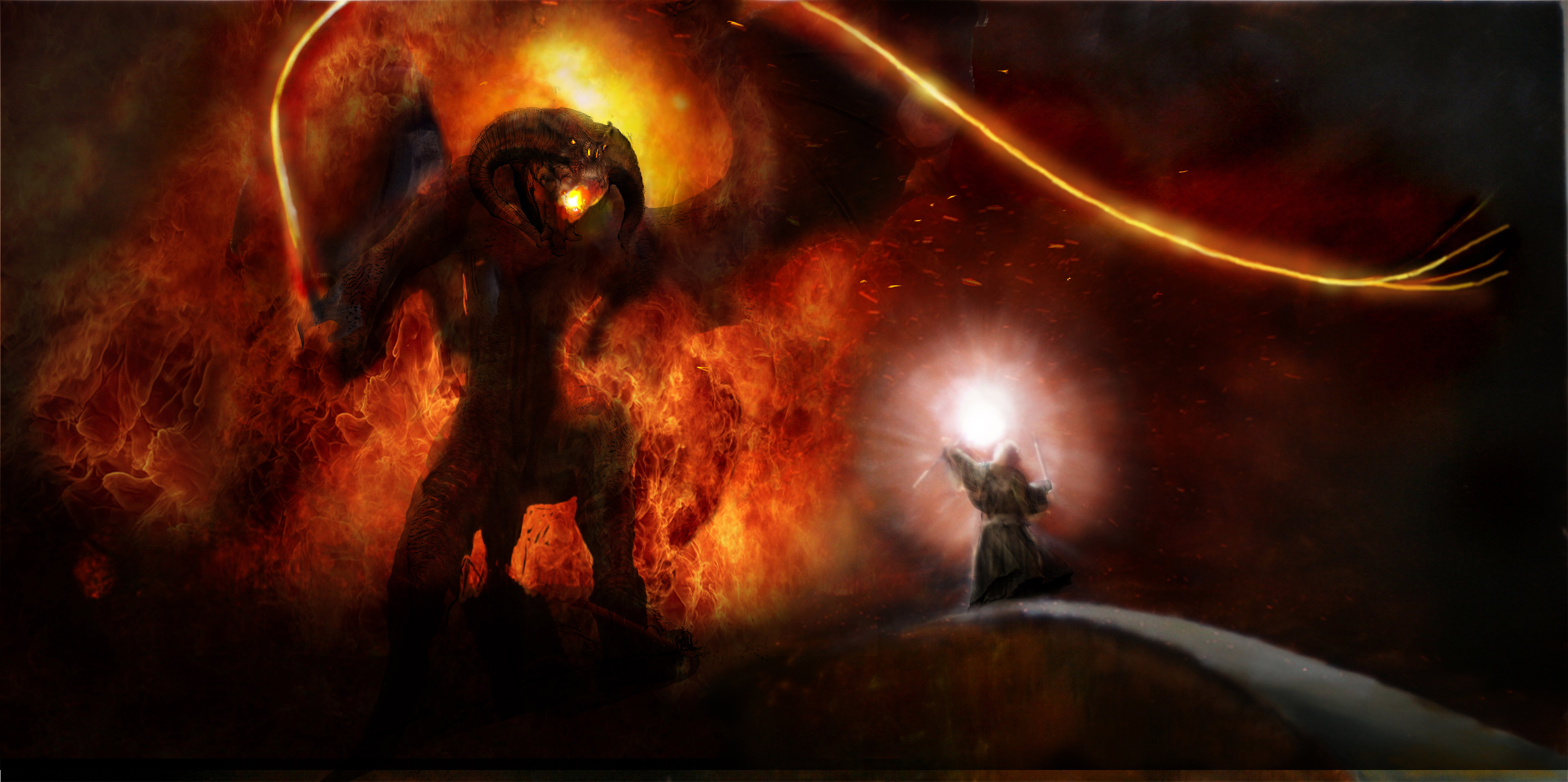 Todo o resto se dá mais ou menos da mesma forma. Vem o Balrog, eles tem de atravessar a ponte, Gandalf fica para trás, “You shall not pass” e tudo o mais. O mago cai e eles escapam para a luz.