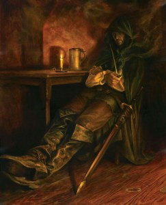 Apesar da ajuda de Glorfindel, Frodo cavalga sozinho para fugir dos cavaleiros. E sozinho os encara após atravessar o rio, mas fraco como está, desfalece no momento em que o rio transborda e carrega os cavaleiros para longe.