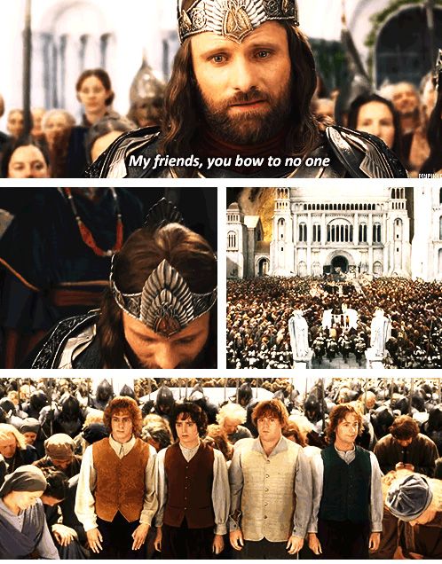 Quando acordam, eles estão em Ithilien e finalmente reencontram Gandalf. Depois de estarem revigorados, eles vão ter com Aragorn e surpreendem-se com cavaleiros em cota de malha e o povo todo reunido para lhes prestarem homenagem. Sam e Frodo então são ovacionados, e canções são escritas para contar sobre seus feitos. Uma honra digna, sem dúvida, mas que substitui uma das melhores cenas de toda a trilogia e sem dúvida a minha preferida: